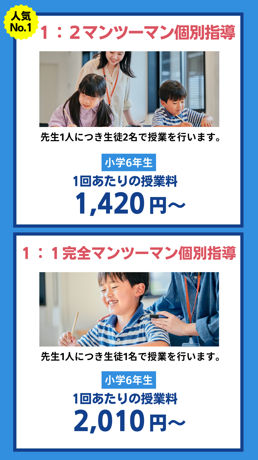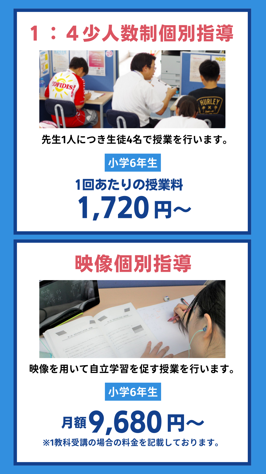 ※受講内容はご希望に合わせて自由に設定することが可能です。選択する教科・回数・コースによって料金は異なります。別途管理費2,300円/月が必要です。