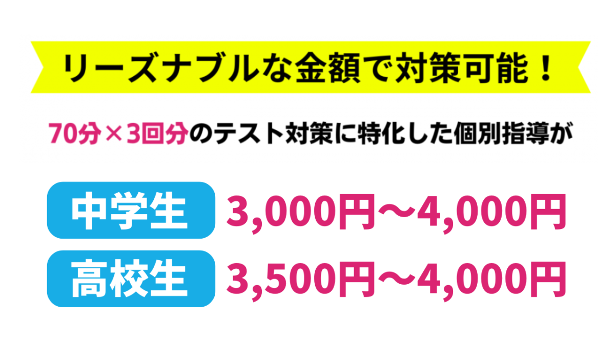 70分×3回分の、テスト対策に特化した授業が以下の料金で受講可能です。