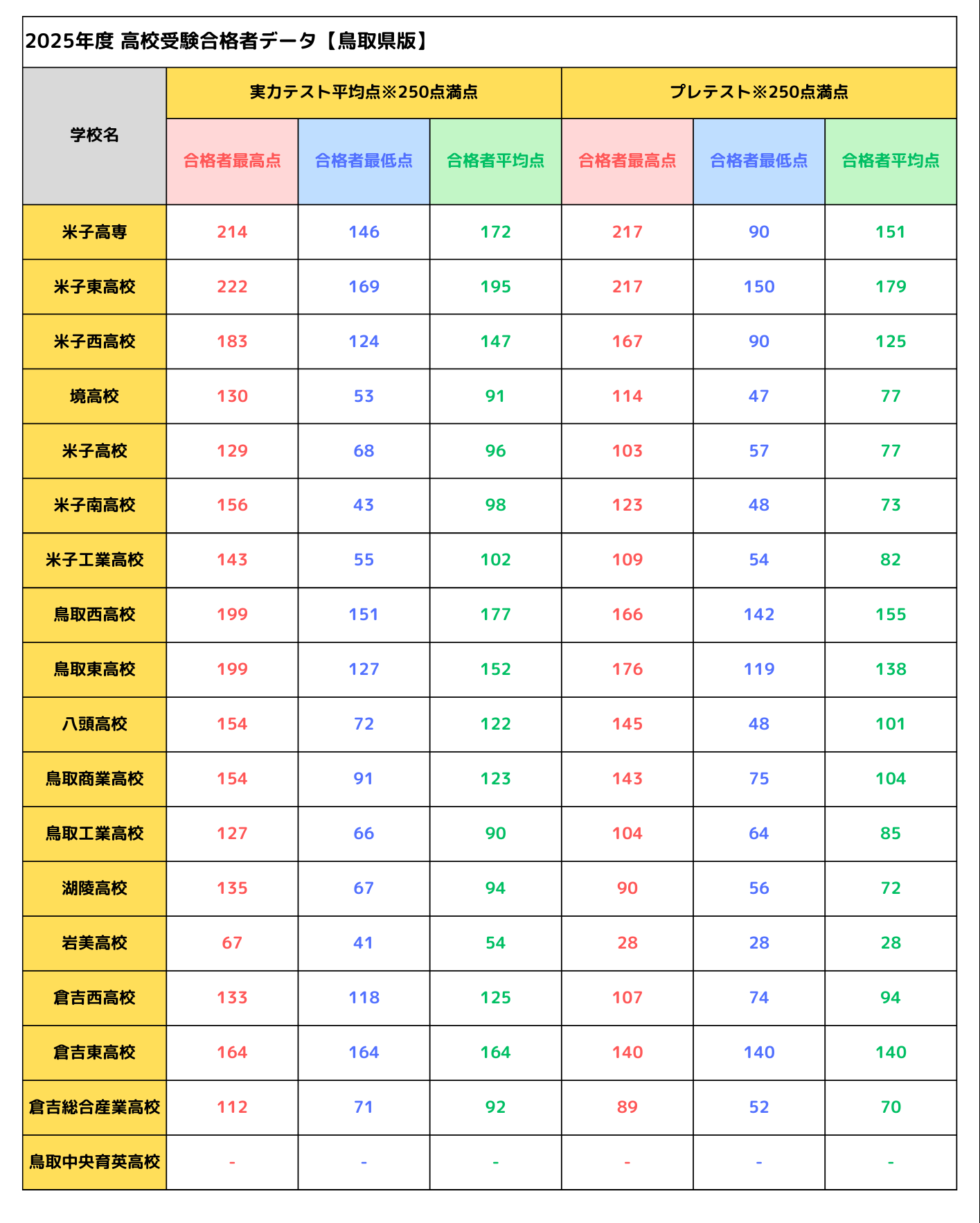 先ほどの鳥取県教育委員会のHPに入学者選抜検査内容等一覧表が掲載されているので確認してみましょう。